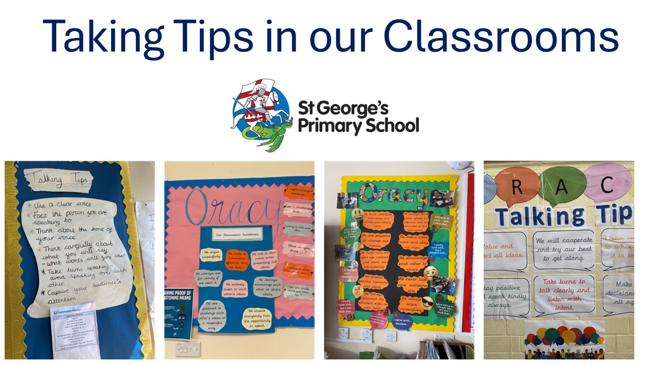 At St George's we have developed clear programs of agreed talking tips and talk tactics to help children practise and master their oracy skills. They will use these in all lessons from P.E to mathematics. These make oracy a norm and develop an emotionally safe culture for all children to participate.