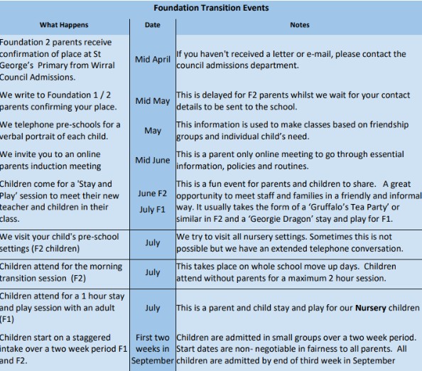 We look forward to welcoming your child into Foundation 2 at St George's. This is the timetable for transition.