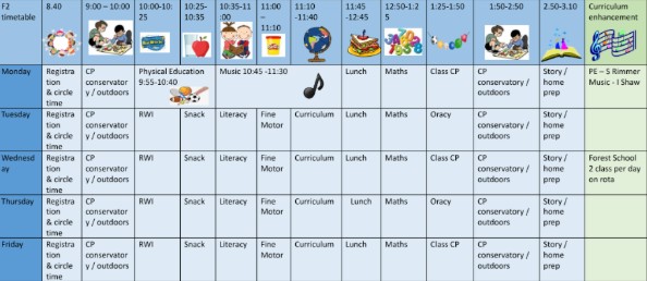 The daily timetable and EYFS environment changes throughout the academic year in response to the children’s needs and stages of development. When children first join the setting in both F1 and F2 they access greater amounts of unstructured time in which to explore their environment and make relationships with new friends.