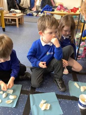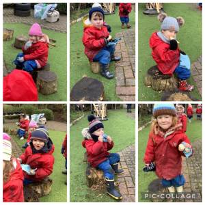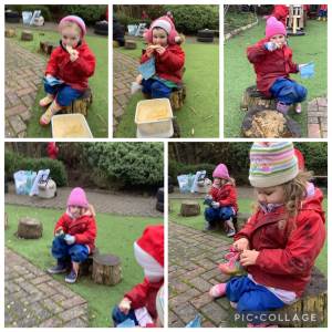 The children have been really enjoying their forest school sessions. They have been using their gross motor skills to climb a tree, balance along a rope bridge, and dig. They have been using their imagination to make delicious food in the mud kitchen, and have loved exploring the nature.