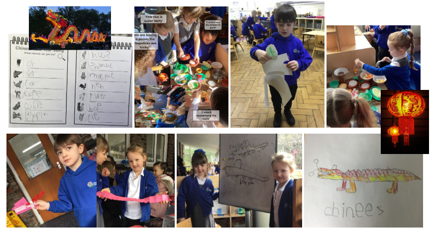 We celebrated Chinese New Year. We learnt that red is their lucky colour as it brings good luck. We discussed which animal we thought would win the great race and made our own dragons. We even tried some Chinese food.
